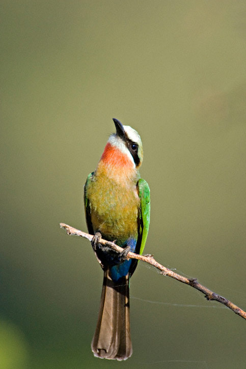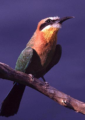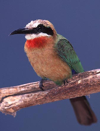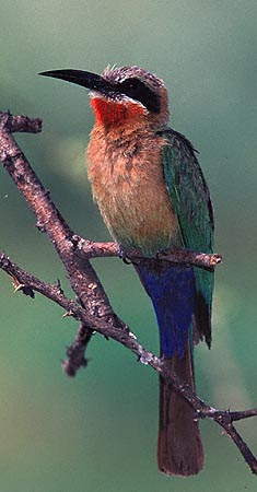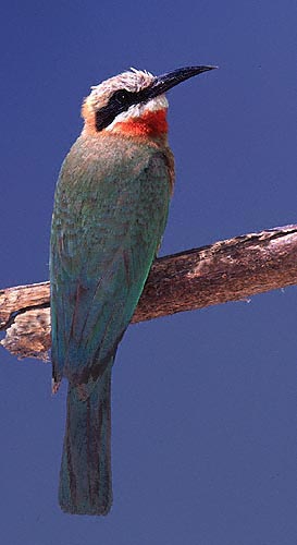 | The White-fronted Bee-Eater (Merops bullockoides) is a cavity nester in earthen banks in many areas of southern Africa. The birds below were photographed near their nesting burrows at Shakawe Lodge, Botswana, in October, 1998. They were photographed with a Canon EOS 1N & EF 300mm F4L IS lens and a 1.4X extender. A 540 EZ flash was used as fill at f5.6 on three of the shots; the photo at the bottom right was taken with available natural light. Note how the fill flash photos show the underparts to better advantage. The film was Fuji Sensia 100 on all images. These photos were all shot hand-held with the camera and lens on a BushHawk shoulder mount. Scroll down for a shot of the fairly unusual yellow-throated form of this species. |