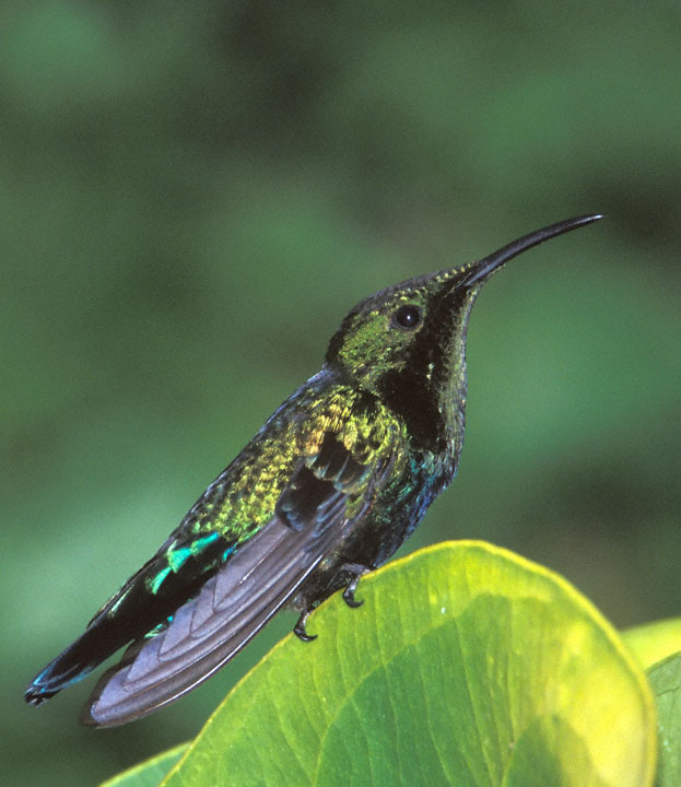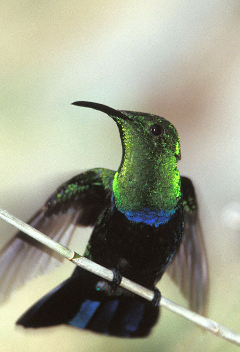 | The Green-throated Carib (Eulampis jugularis) is a beautiful hummingbird which is resident in the Lesser Antilles, the Virgin Islands and Puerto Rico. The shots shown here were taken on the island of Saba in the Lesser Antilles in July, 2001, with a Canon EOS 3 and EF 500 mm F4L IS lens on Fuji Velvia. | ![]() |