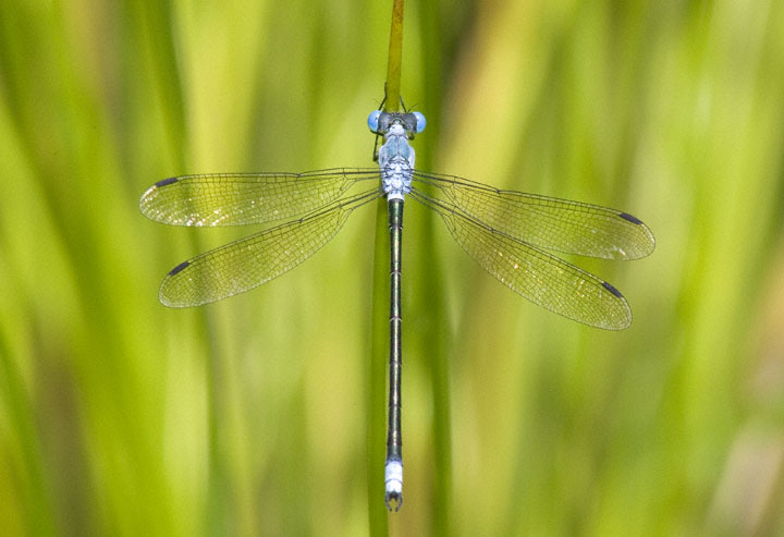 The Amber-winged Spreadwing (Lestes eurinus) is a fairly widespread damselfly across the northeast third of the United States as well as parts of southeast Canada. It occurs west to Kansas and south to Georgia and Alabama. The shots here, digital images of a male, were taken in Tuscarawas Co., Ohio, in July, 2005, with a Canon EOS 1D Mark II and EF 300mm F/4 L IS lens and a 2X extender and 580 EX flash. | ![]() |