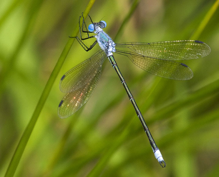 The next 3 images of a male Amber-winged Spreadwing were taken along the Little Black River in Ripley Co., Missouri, in June 2009, with a Canon EOS 1D Mark III and EF 300mm F/4 L IS lens and 2X extender and 580 flash. | ![]() |