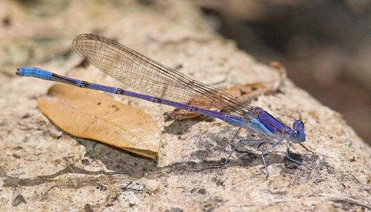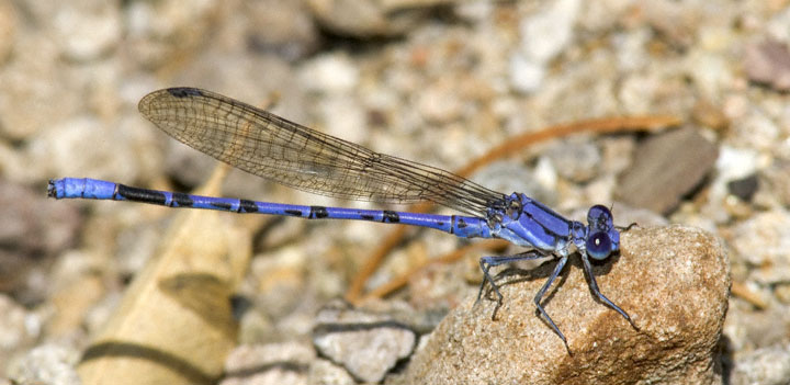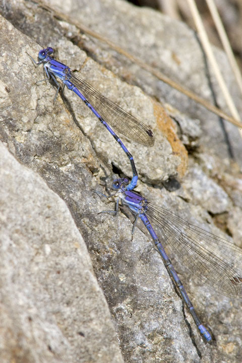 The Apache Dancer (Argia munda) is a damselfly of the southwestern U.S., where it occupies desert and mountain streams. The photos here of a male and a pair in tandem were shot along a clear stream in the Davis Mountains of west Texas in June, 2005. The images were a digital captures with a Canon EOS 1D Mark II and EF 180 Macro lens with a 1.4 extender and flash. The coloration of the species can be variable from purple to blue. |