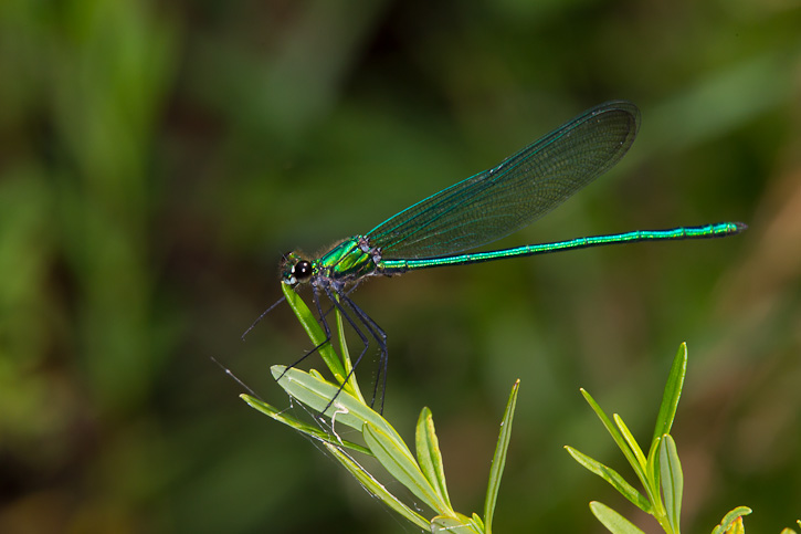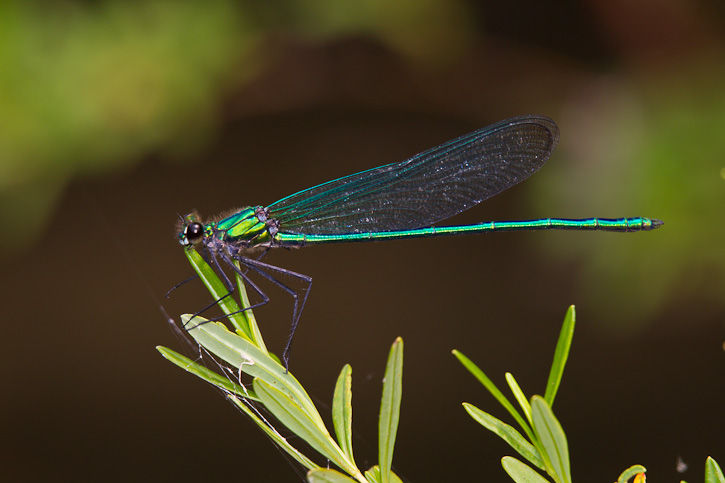 The Appalachian Jewelwing (Calopteryx angustipennis) occurs in fast flowing, clear streams and rivers in the Appalachian area of the eastern United States. It is a very striking, large damselfly, and shows green veins in the leading edge of the wings. The first six images on this page were taken along the Chattooga River in Rabun Co., Georgia, in May, 2011, with a Canon EOS 1D Mark IV and a Sigma 50-500mm lens and Canon 580 flash. The first five shots show males. |
