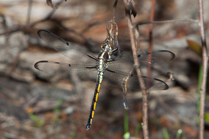 In early May, 2009, I was back at the same location where the above images were taken. It was a dark and cloudy morning, but I found several teneral male and female Bar-winged Skimmers. The next 3 shots were taken with a Canon EOS 50D and an EF 70-200mm F/2.8 L IS lens and 2X extender and 580 flash. The shot shown here shows a young male while the next 2 shots show a female. |