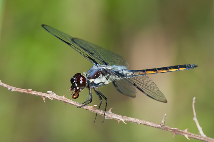 The male Bar-winged Skimmer with a prey item shown here was at the same location as the previous shots, but in June, 2009. The same photo gear was used for this shot. |