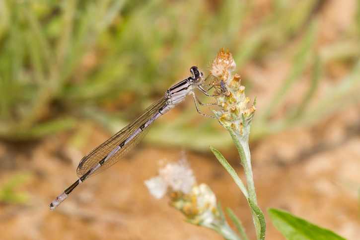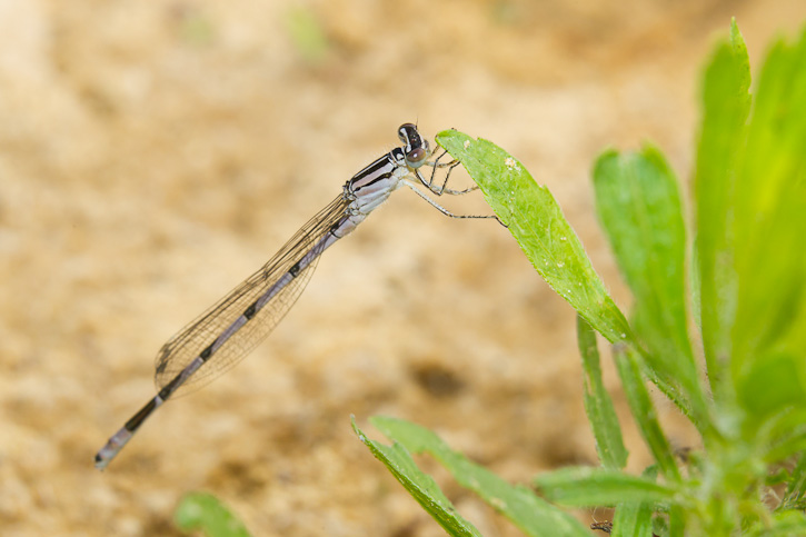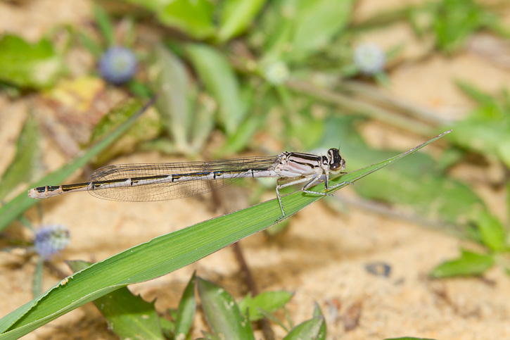 The Big Bluet (Enallagma durum) is a damselfly that occurs from Texas, around the Gulf of Mexico, up the Atlantic coast to Maine. This species typically inhabits brackish water near the coast, but it is also known from some locations well inland where there is some degree of salinity to the water. It has been found as far inland as Tennessee. The first seven images on this page were taken on the shore of Lake Sam Rayburn, San Augustine Co., Texas, in April, 2011, with a Canon EOS 1D Mark IV and a Sigma 50-500mm lens and Canon 580 flash. The species is visually similar to Familiar Bluet (E. civile), but larger in size and has quite different appendages. A mature male is on the right. | ![]() |