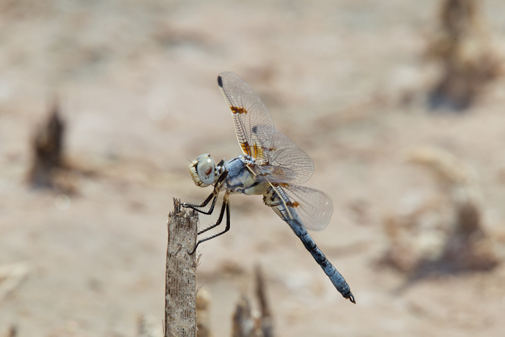 The Bleached Skimmer (Libellula composita) is a pale colored skimmer with distinctly marked wings of desert areas from parts of Texas west to California. The species often is associated with alkaline marshes or occasionally hot springs and lake edges. The first eight shots on this page show male Bleached Skimmers at the BLM overflow wetlands near Bottomless Lakes State Park, Chavez Co., New Mexico, in August, 2011. These shots were taken with a Canon EOS 1D Mark IV and a Sigma 50-500mm lens and Canon 580 flash. | ![]() |