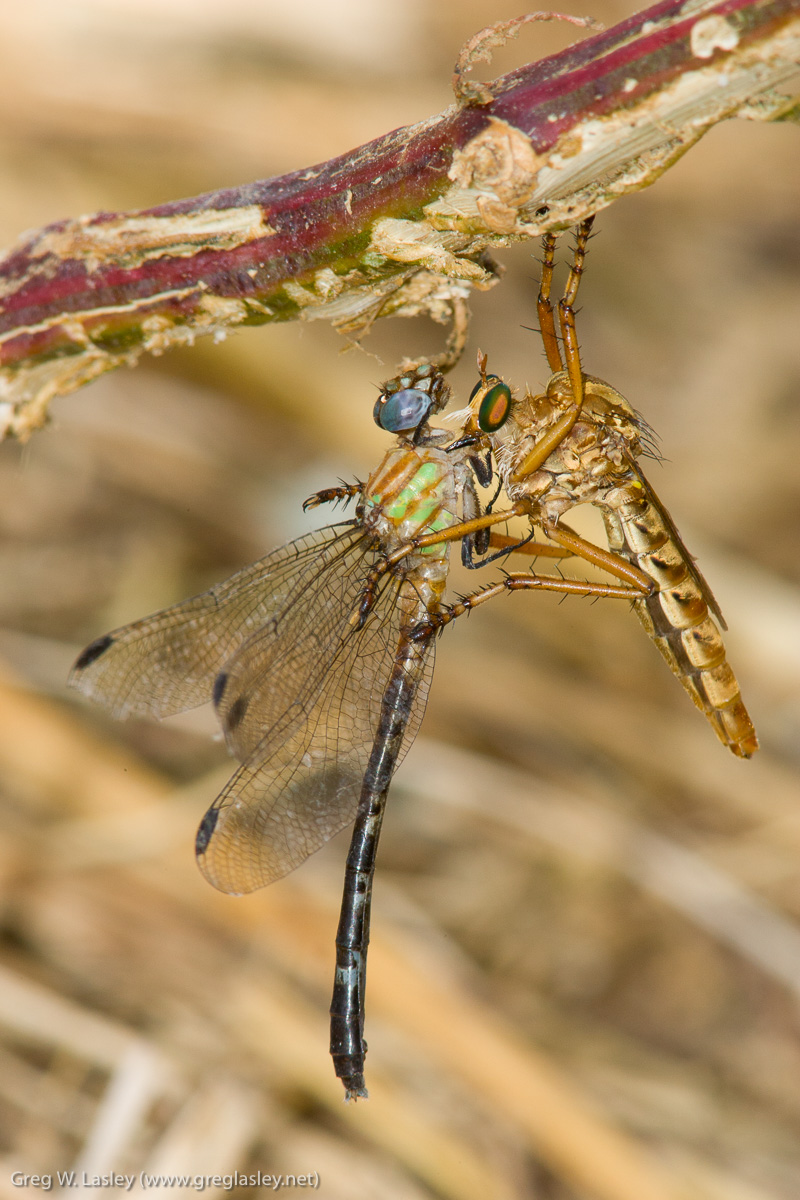 This shot shows a Robber Fly (genus Diogmites) that has captured an adult female Blue-faced Ringtail. | ![]() |