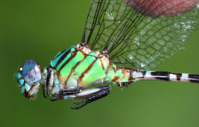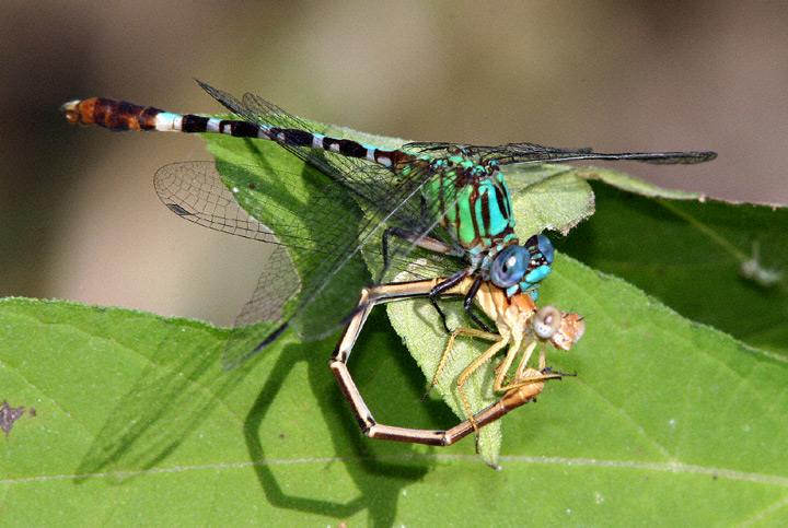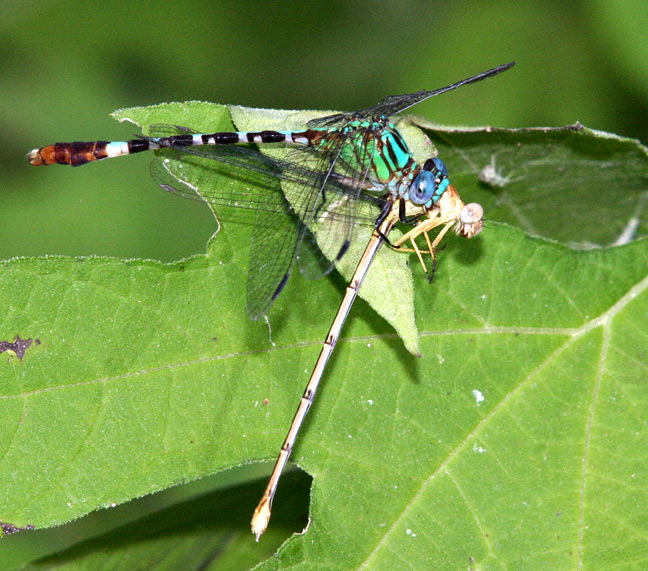 The Blue-faced Ringtail (Erpetogomphus eutainia) is a little-known dragonfly which has been found in the United States only in south central Texas (although it occurs from Mexico to Costa Rica in Central America). The only documented Texas records, as of December, 2010, are from Bexar, Caldwell, DeWitt, Gonzales, Maverick, and Webb Counties along the Rio Grande, San Marcos, Medina, and Guadalupe Rivers. The species is not found very often and there had apparently been very few reports of it between the 1970s and 2003. During the summer of 2003, I made a concerted effort to locate this species. I spent several weeks in my spare time working public areas along the San Marcos and Guadalupe Rivers without success. Finally, in late July, I found a female Blue-faced Ringtail in Gonzales, Texas. It is an inconspicuous dragonfly which flies slowly in an almost "damselfly-like" manner. I obtained several shots of this female in July, but wanted to try for better images. On 2 August 2003, John Abbott and I returned to the spot where I had located the female and had great luck in finding a male and a female Blue-faced Ringtail! We got excellent photos of both sexes and even watched the male catch and consume a female Powdered Dancer (Argia moesta). All the initial shots here were near the banks of the Guadalupe River in Independence Park, Gonzales, Gonzales Co., Texas. These digital captures were shot with a Canon EOS 10D and EF 70-200 mm F/2.8 L IS lens with a 2X extender and 550 EX flash. The first two shots show a male Blue-faced Ringtail with a female Powdered Dancer it has captured. | ![]() |