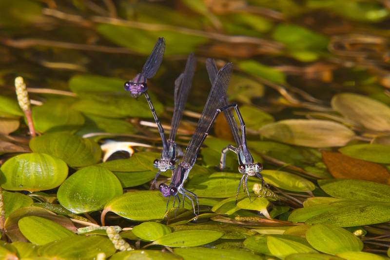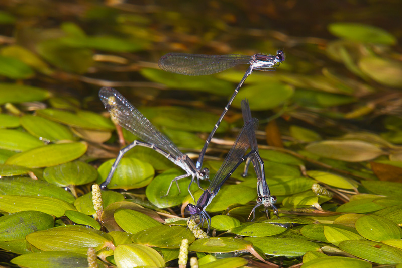 The next two shots of pairs of Blue-tipped Dancers were taken along Indian Creek, Jasper Co., Texas, in April, 2012. These shots were taken with a Canon EOS 1D Mark IV and a Sigma 50-500mm lens and Canon 580 flash. | ![]() |