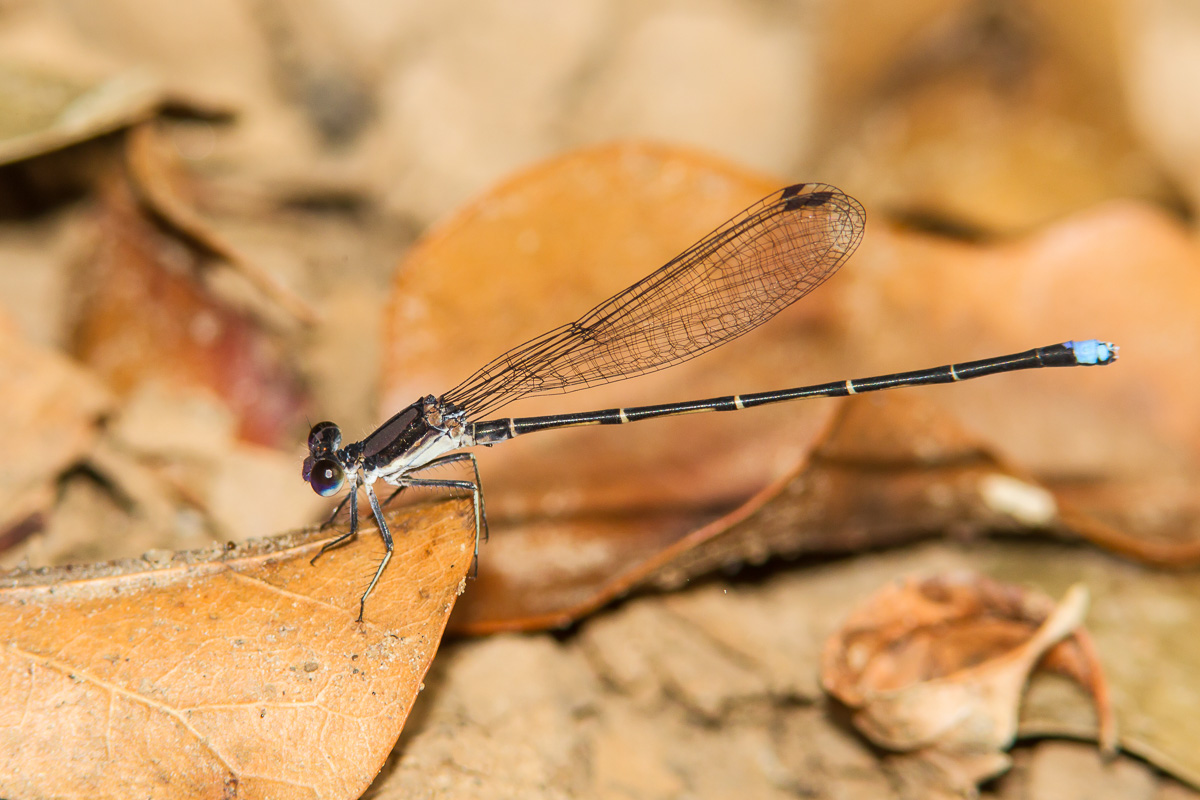 The female Blue-tipped Dancer to the right and the male in the next shot were both along Indian Creek, Jasper Co., Texas, in April, 2012. These shots were taken with a Canon EOS 1D Mark IV and a Sigma 50-500mm lens and Canon 580 flash. | ![]() |