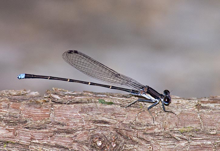 The Blue-tipped Dancer (Argia tibialis) is a widespread eastern damselfly that occupies a wide range of habitats from swamps and bayous to flowing streams and rivers. The photos here were shot along a stream in San Jacinto Co., Texas in June 2003. The images were digital captures with a Canon EOS 10D and EF 70-200 mm F2.8 L IS lens with a 2X extender and a 550 flash. | ![]() |