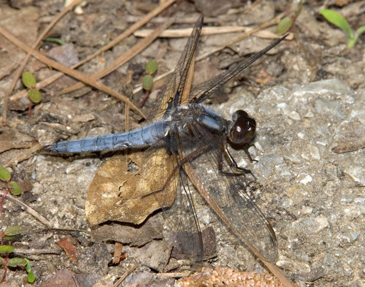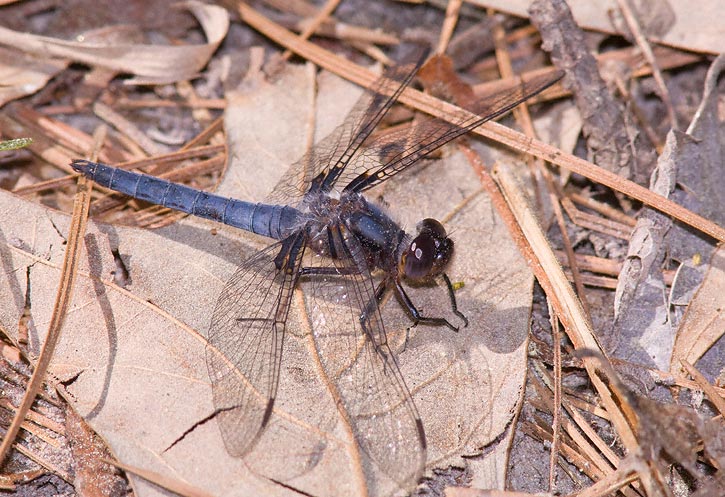 The Blue Corporal (Ladona deplanata) is a moderate sized southeastern dragonfly which reaches its western limit in central Texas. The first three shots on this page were digital captures with a Canon 10D and EF 70-200 F/2.8 L IS lens and 2X extender and 550 EX flash in the Sam Houston National Forest, San Jacinto Co., Texas in early April, 2004. There are two shots of males, one on the ground and one resting on the trunk of a pine tree and also a shot of a female on the ground. | ![]() |