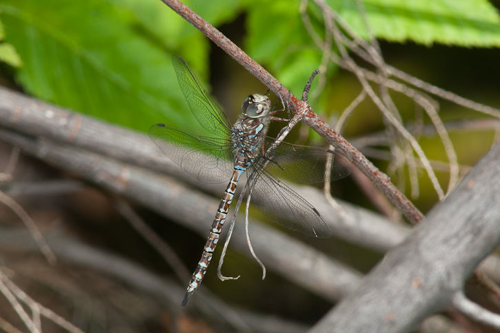 The Canada Darner (Aeshna canadensis) is a large dragonfly that occurs across the northern U.S. and much of Canada. It is not often found perched, so many shots of this species, including these, are posed. The shots of this male was taken in Algonquin Provincial Park, Nipissing Co., Ontario, Canada, in July, 2005, with a Canon EOS 1D Mark II and EF 300mm F/4 L IS lens with a 2X extender and 580 EX flash. |