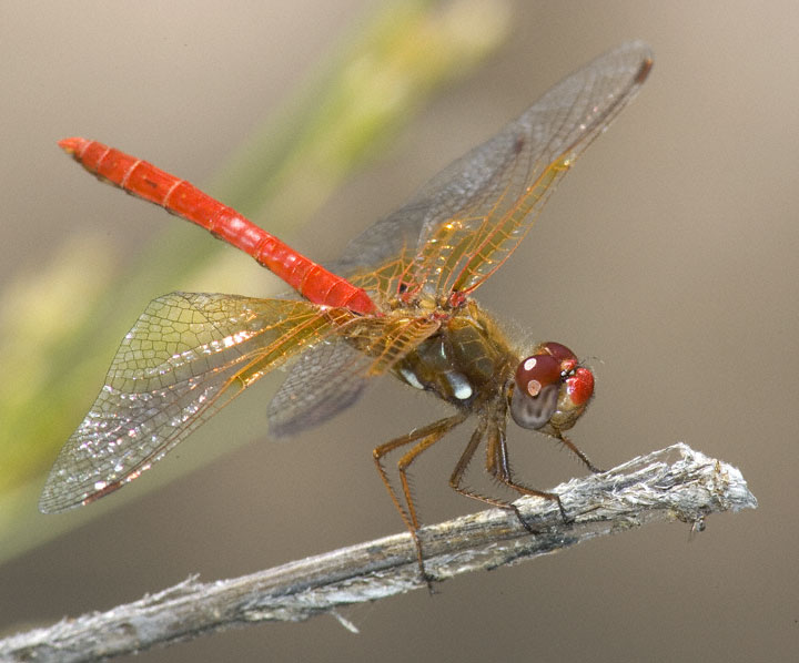 Within the U.S., the Cardinal Meadowhawk (Sympetrum illotum) is a dragon of the southwest, but the species also occurs into South America. It is uncommon and local in west Texas. The male shown here was photographed at a pool along a stream in the Davis Mountains of west Texas in June, 2005, with a Canon EOS 1D Mark II and an EF 300mm F/4 L IS lens, 2x extender and 580 flash. | ![]() |