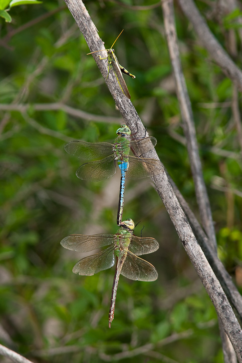 The pair of Common Green Darners in tandem shown here was at Santa Ana N.W.R., Hidalgo Co., Texas, in September, 2009. The same photo gear as previously described was used. | ![]() |