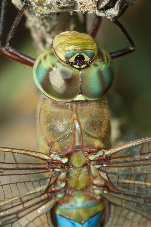 The close-up of the head and thorax of a male Common Green Darner shown here was taken in Austin, Travis Co., Texas, in November, 2009, with a Canon EOS 50D and a Sigma 150mm F/2.8 Macro lens. | ![]() |