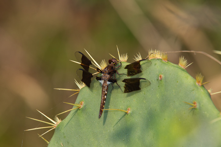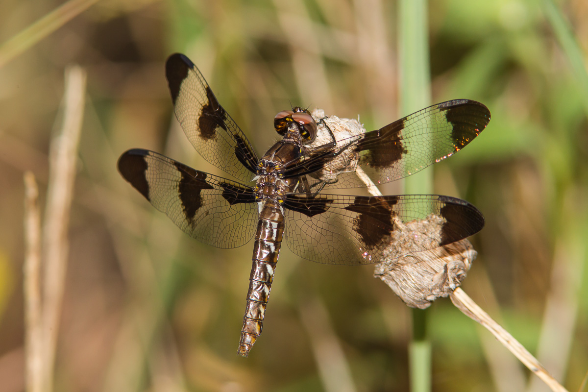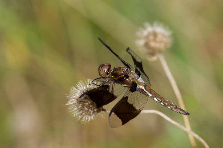 The Common Whitetail (Plathemis lydia) is a very common dragonfly across the entire U.S. The male has large black patches on clear wings with a white abdomen, but the female is quite different, lacking the white abdomen and showing a different wing pattern. The photo of the male at right was a digital capture in western Travis Co., Texas in April,l 2003, with a Canon EOS 10D and EF 70-200 F2.8 L lens with 2X extender. | ![]() |