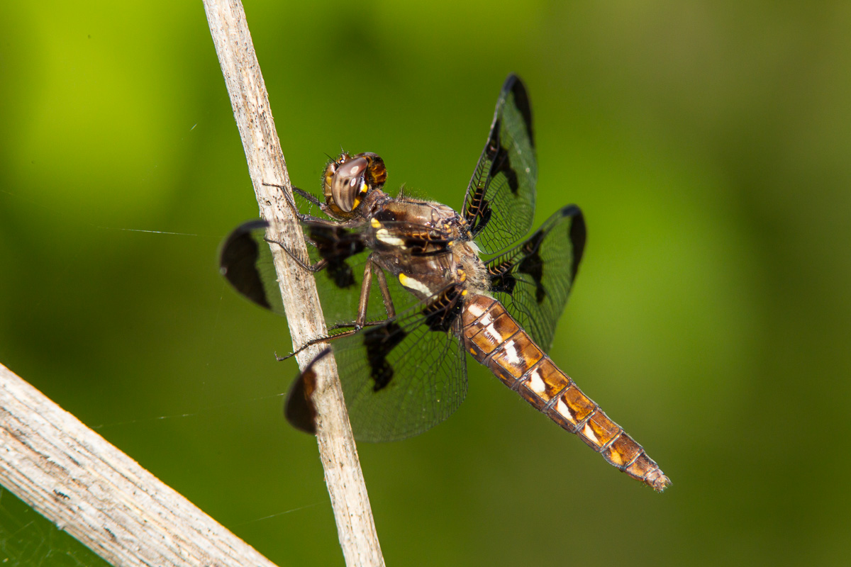 The shots of the male Common Whitetail shown here and in the next 2 shots at right were taken along the Little Black River in Ripley Co., Missouri, in June, 2009. These shots were all taken with a Canon EOS 1D Mark III and EF 300mm F/4 L IS lens and 2X extender and 580 flash. One shot at right shows two male whitetails on the same perch while another shows a male Common Whitetail and a male Spangled Skimmer (Libellula cyanea). | ![]() |