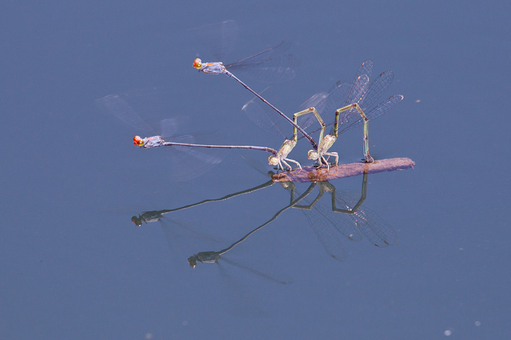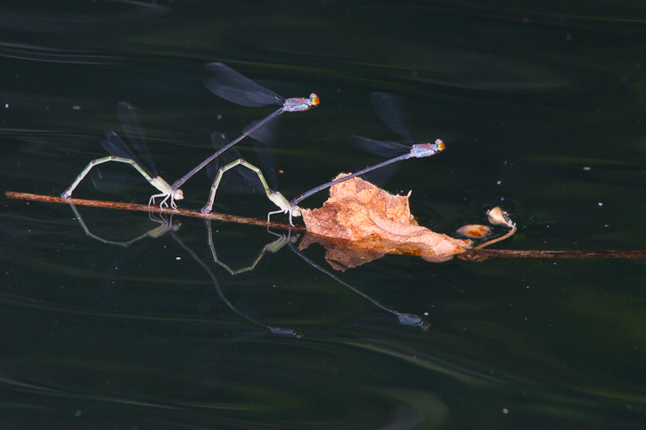 The next 5 images show tandem pairs of Coral-fronted Threadtails along the San Marcos River in San Marcos, Hays Co., Texas, in August, 2010. These shots were also taken with a Canon EOS 1D Mark IV and a Sigma 50-500mm lens and Canon 580 flash. |