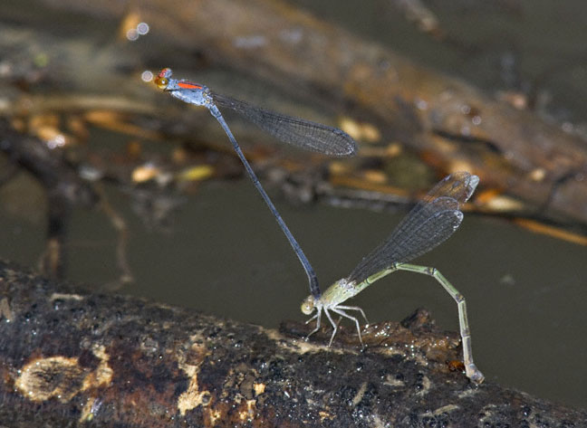 The current in the river was moderately swift. We sat on a sidewalk near a bridge and watched numerous pairs of Coral-fronted Threadtail (Neoneura aaroni) in tandem. There were leaves, sticks and other small debris floating along in this channel being carried by the current. Just downstream from the area where we were sitting the water flowed udder a low concrete bridge where it was dark, the top of the bridge being only about 10 inches above the water's surface. The tandem pairs of threadtails would land on a tiny stick or other debris and the females would being to probe and oviposit into the wood, but as soon as the small woody debris would start to flow under the bridge and into the dark, the damsels would take off and try to find a new perch out in the open. We then began watching as the males would start to fly upstream, against the current, while the female was perched on the tiny stick in the process of laying eggs. The males would literally pull against the current and in effect keep the stick from going under the bridge while the female did her work. Sometimes two pairs would land on the same stick and all 4 individuals would work against the current and actually pull the stick upstream for several feet, a herculean effort it seemed. This continued for the hour or so we sat there and watched. I had never seen this behavior before, but perhaps others have. In any event, I thought it was very interesting. |