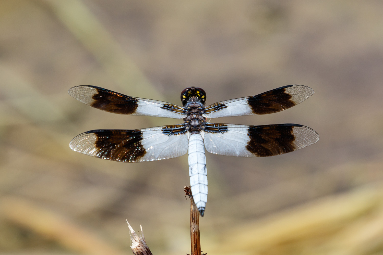 The Desert Whitetail (Plathemis subornata) occurs across much of the southwestern United States and parts of Mexico. The first 6 shots shown here were all taken near Marathon, Brewster Co., Texas, in September, 2009, with a Canon EOS 1D Mark III and an EF 300mm F/4 L IS lens and 2X extender and 580 flash. | ![]() |