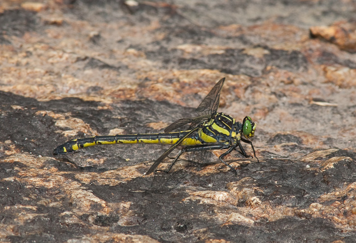 The Dragonhunter (Hagenius brevistylus) is a large, showy clubtail which occurs across much of the eastern and southern United States. As the name implies, it often feeds on other dragonflies, sometimes nearly as large as itself. The first two shots here were digital captures in Uvalde Co., Texas in May, 2003, and were shot with a Canon EOS 10D and EF 300 mm F/4 L IS lens with a 1.4X extender and 550 EX flash. This particular individual was perched along the edge of a fairly rapidly flowing Texas Hill Country stream as it watched for prey. | ![]() |