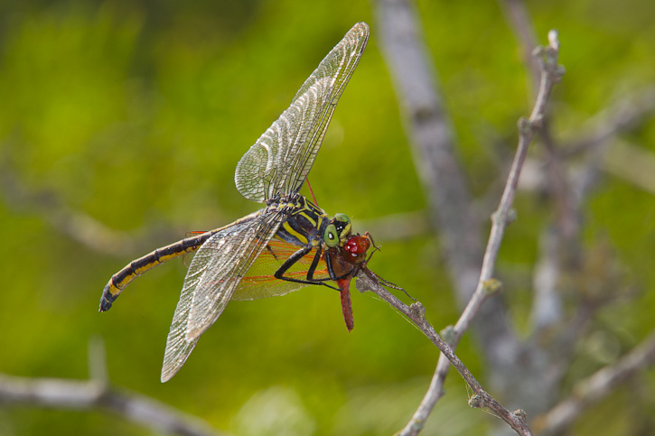 The next 2 Dragonhunter shots were taken in Austin, Travis Co., Texas, in August, 2010, with a Canon EOS 1D Mark IV and a Sigma 50-500mm lens and Canon 580 flash. The individual shown here has captured a Needham's Skimmer as prey. | ![]() |