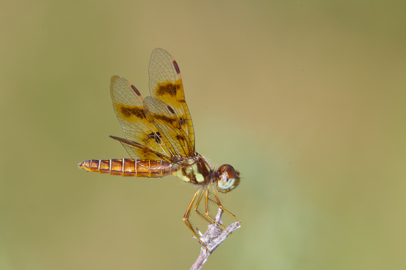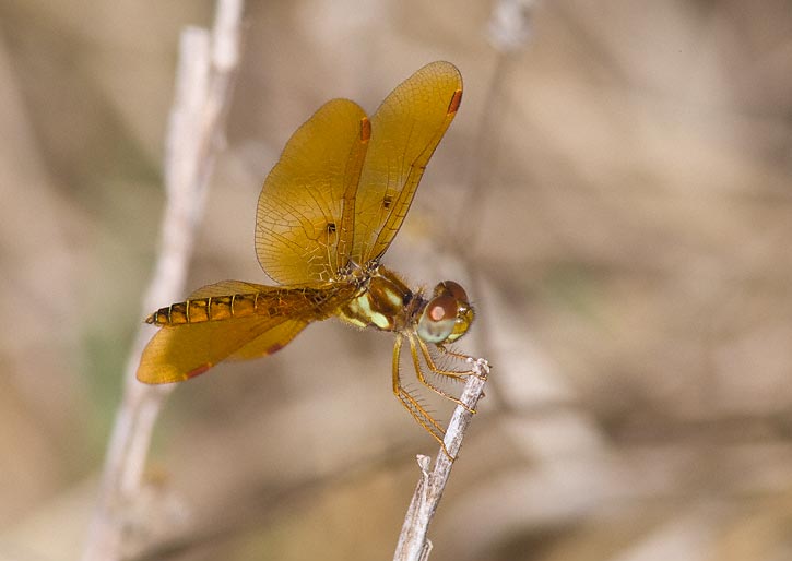 The female Eastern Amberwing shown here was in Austin, Travis Co., Texas, in August, 2009. This image was taken with a Canon EOS 1D Mark III and an EF 300mm F/4 L IS lens and 2X extender and 580 flash. | ![]() |