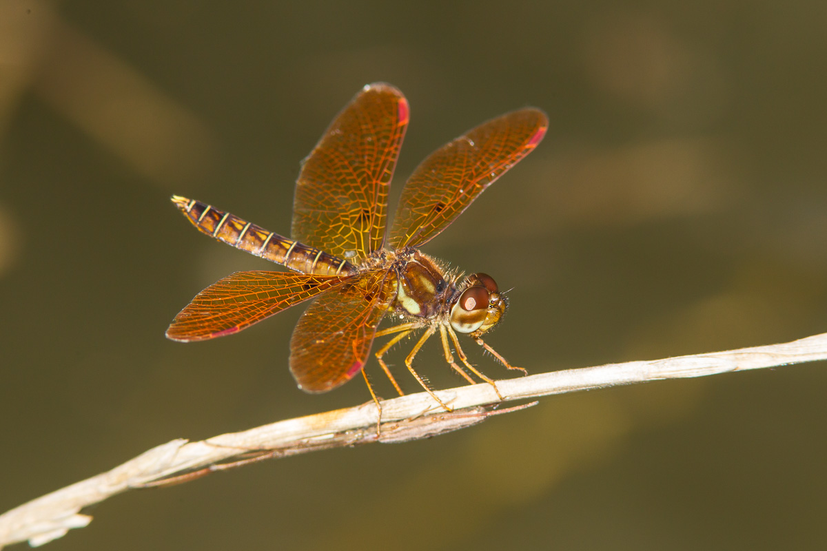 The next three shots show male Eastern Amberwings at Austin, Travis Co., Texas, in August, 2007. These shots were taken with a Canon EOS 1D Mark III and the same lens and flash as the previous images. | ![]() |