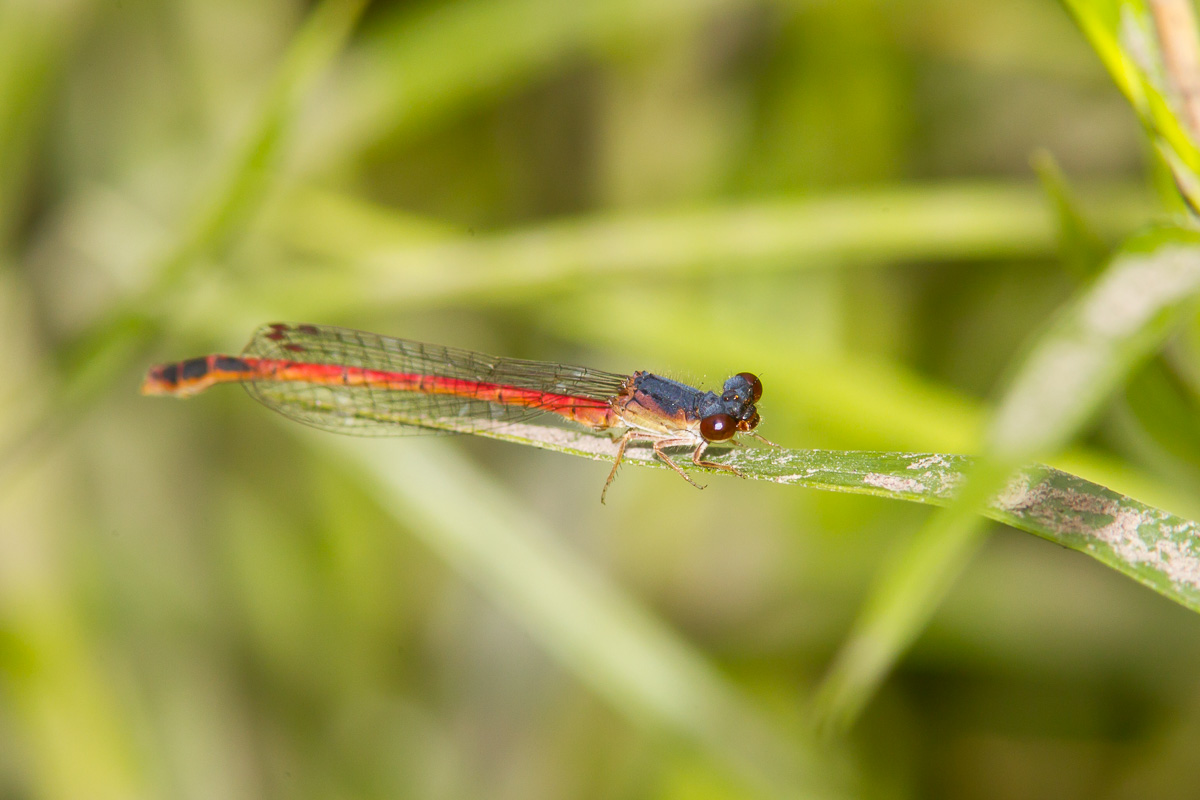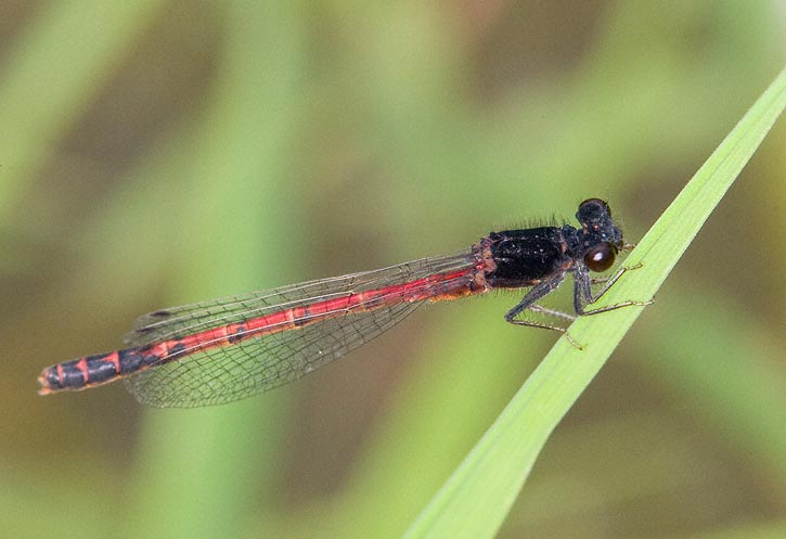 The Eastern Red Damsel (Amphiagrion saucium) is a tiny damselfly of the eastern United States and occasionally as far west as the Dakotas and Oklahoma. It is visually very similar to the Western Red Damsel (A. abbreviatum) and care is needed to separate them in areas of overlap. The first 3 images on this page are all of males and were taken near Caledonia, Houston Co., Minnesota, in July, 2004, with a Canon EOS 1D Mark II and EF 300mm F/4 L IS lens and 2X extender and 550 flash. | ![]() |