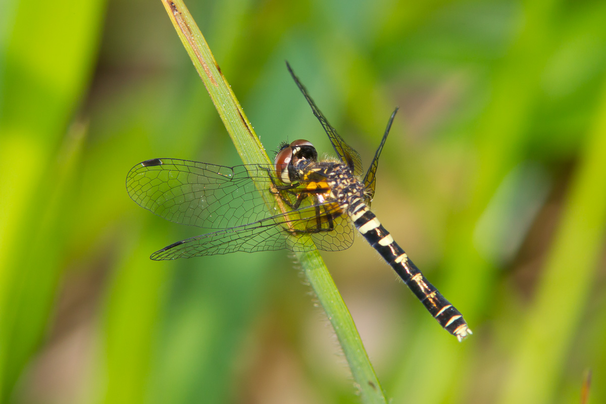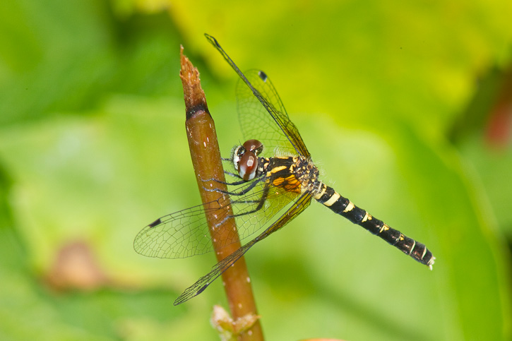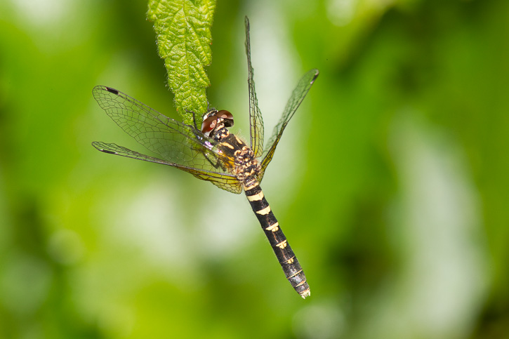 The shot on the right shows a male Dragonhunter (Hagenius brevistylus), one of the largest North American dragonflies, held next to a male Elfin Skimmer, the smallest North American dragonfly. The image provides an interesting size comparison. These two dragons were netted near Spur Lake, Marinette Co., Wisconsin, in July, 2011. | ![]() |