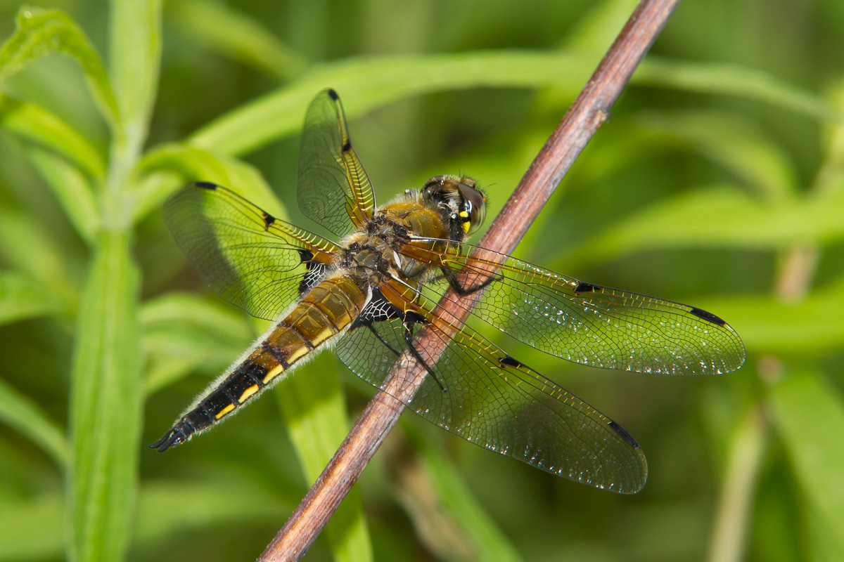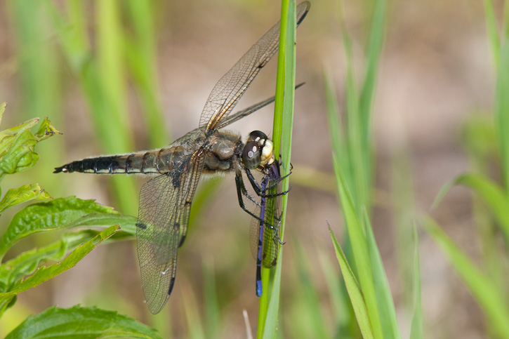 The Four-spotted Skimmer (Libellula quadrimaculata) is a widespread dragonfly over most of the U.S. and Canada, but it is absent from the south central and southeast United States. The first 2 shots here, of a female, were taken near Arnprior, Renfrew Co., Ontario, Canada, in July, 2005, with a Canon EOS 1D Mark II and EF 300mm F/4 L IS lens with a 2X extender and 580 EX flash. | ![]() |