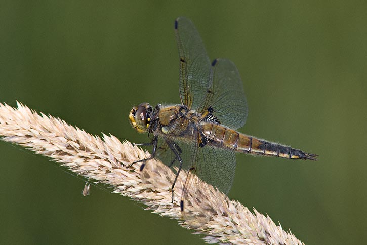 The female Four-spotted Skimmer in the next 2 shots was near Unity, Baker Co., Oregon, in July, 2008. These images were taken with a Canon EOS 1D Mark III and EF 300mm F/4 L IS lens and 2X extender and 580 flash. | ![]() |