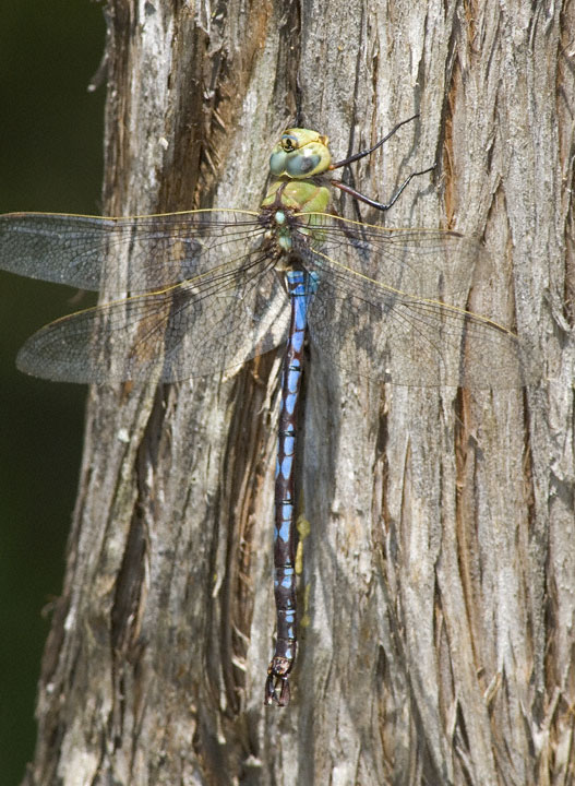 The Giant Darner (Anax walsinghami) is usually considered among the largest dragonflies in North America. It occurs in the southwest U.S. as well as parts of western Mexico and southward to the Honduras. In 2004, a population of this species was discovered in the central Texas county of Travis, very near Austin. Through July, 2005, the species has remained locally common at this particular spot, fully 300 miles east of the closest known populations in west Texas. The two shots here of a male from the Travis Co. population are posed photos. These darners are seldom encountered perched, so wild shots are very difficult to come by. The shots were taken with a Canon EOS 1 D Mark II and 300 mm F/4 L IS lens and 580 flash. | ![]() |