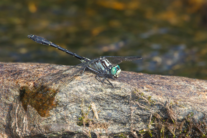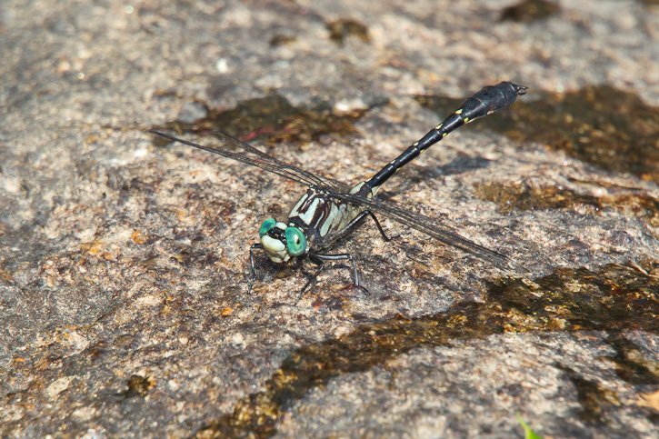 The Green-faced Clubtail (Gomphus viridifrons) occurs from parts of Alabama and Georgia north through the Appalachians to New York, Pennsylvania, and Ohio, then northwest into Wisconsin and Minnesota. It is a dragonfly of clear, flowing rivers and streams. Its face is pale green in color with two very fine lines that are difficult to see. It may show a small amount of yellow on the club. The top five shots on this page were taken along the Chattooga River which forms the boundary between Rabun Co., Georgia and Oconee Co., South Carolina, in May, 2011, with a Canon EOS 1D Mark IV and a Sigma 50-500mm lens and Canon 580 flash. | ![]() |