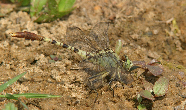 The mature Jade Clubtail shown here has a bent abdomen as well as disfigured wing tips. It has probably spent its adult life like this and it seemed to fly without trouble. | ![]() |