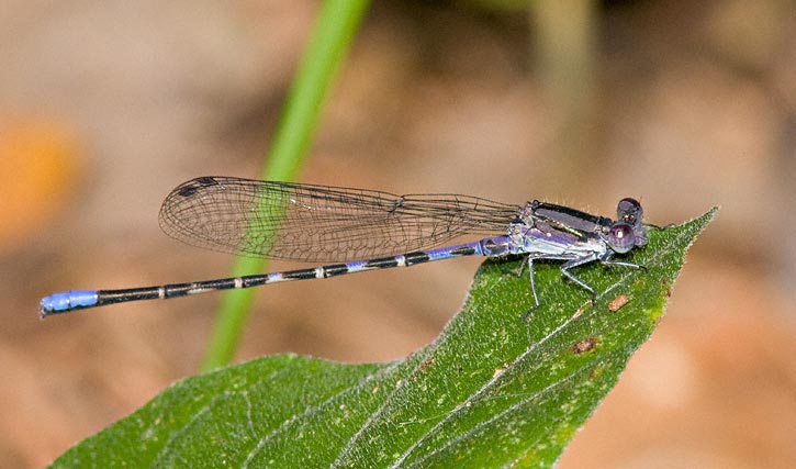 The Kiowa Dancer (Argia immunda) occurs from Texas and Oklahoma westward. The first photo here of a male was a digital capture with a Canon EOS 10D and EF 70-200 mm F2.8 L IS lens with a 2X extender and 550 EX flash on the Balcones Canyonlands NWR, Burnet Co., Texas in June 2003. The next photo, of a female, was also a digital capture in Travis Co., Texas in June 2003, but using a 180 mm Macro lens and ring flash. | ![]() |