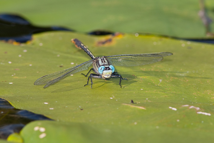 The Lilypad Clubtail (Arigomphus furcifer) is an uncommon clubtail of the northeastern United States. As its common name implies, it often perches on lilypads. The first 10 images on this page were taken at a small lake near Freyburg, Oxford Co., Maine, in June, 2010, with a Canon EOS 1D Mark III and EF 300mm F/4 L IS lens and 2X extender and Canon 580 flash. | ![]() |