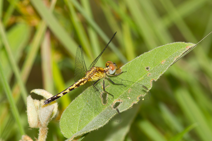 The Little Blue Dragonlet (Erythrodiplax minuscula) is a very small dragonfly of the southeastern U.S. (ranging north to Maine) where it can be found at vegetated ponds and backwaters. The photo here of a female was a digital capture in the Angelina National Forest, Angelina Co., Texas in May, 2003, with a Canon EOS 10D and EF 300 mm F4 L IS lens with a 1.4X extender and 550 EX flash. This dragon was resting on some grass at the edge of a small pond in an area that had been burned by a forest fire about 5 years earlier. | ![]() |