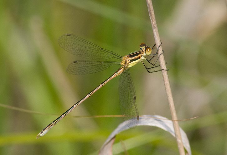 The young male Lyre-tipped Spreadwing in the next two images was along the Arikaree River in Yuma Co., Colorado, in June, 2007. These two shots were taken with a Canon EOS 1D Mark III and EF 300mm F/4 L IS lens and 2X extender. |