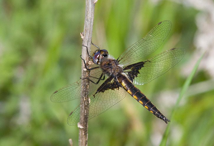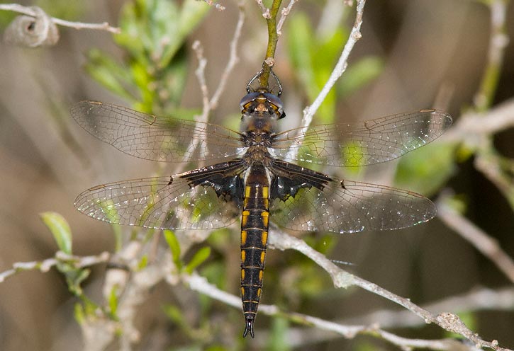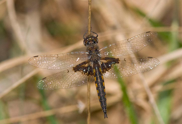 The Mantled Baskettails in the next 4 images were in the Davy Crockett National Forest, Houston Co., Texas, in March 2008. These images were taken with the same gear as described just previously. The dusting of small specks on the abdomen of the dragonfly shown here was pollen, probably pine pollen, which was in the air and thick on the ground on this day. | ![]() |