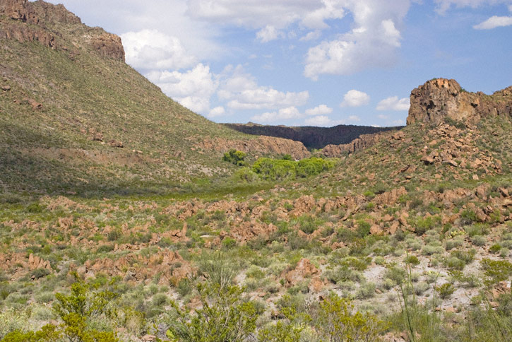 The image shown here shows a view of Ojito Adentro, a desert canyon within Big Bend Ranch State Park. This shot, from September, 2005, shows the primary location where this species has been found within Texas. There have been a few scattered records at other locations, but it is along the stream flowing under the distant trees in this image where the species is most regular. | ![]() |