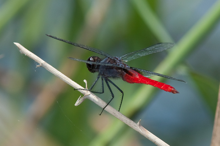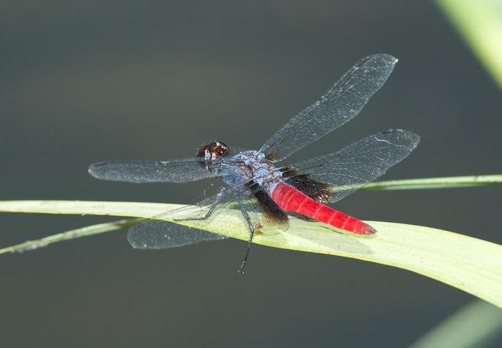 The Mexican Scarlet-tail (Planiplax sanguiniventris) is a small dragonfly of ponds and lakes in parts of Mexico and Central America. In June, 2008, a few of these tropical dragons showed up on a resaca at Bentsen Rio Grande State Park, Hidalgo Co., Texas, providing a first record for the U.S. The shot of a male shown here was taken at that location in late June, 2008. I was not as close as I would have liked to this bug, so the image was cropped quite a bit. This is a spectacular dragonfly and many of us hope it will become a regular component of the fauna of south Texas. This shot was taken with a Canon EOS 1D Mark III and EF 300mm F/4 L IS lens and 2X extender and Canon 580 flash. |