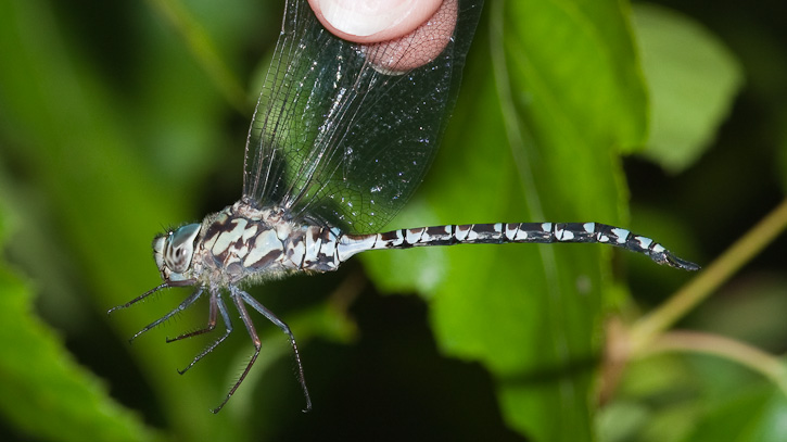 The Mottled Darner (Aeshna clepsydra) is a late season species of the northeastern United States and a few aras of southeast Canada. The first two images show an adult male in hand while the next two shots show a newly emerged Mottled Darner still partially attached to the exuviae. Unfortunately, this individual had some sort of problem with its wing which never could be separated from the exuviae so it would not survive. These 4 shots were all taken in Rockingham Co., New Hampshire in August, 2009. | ![]() |