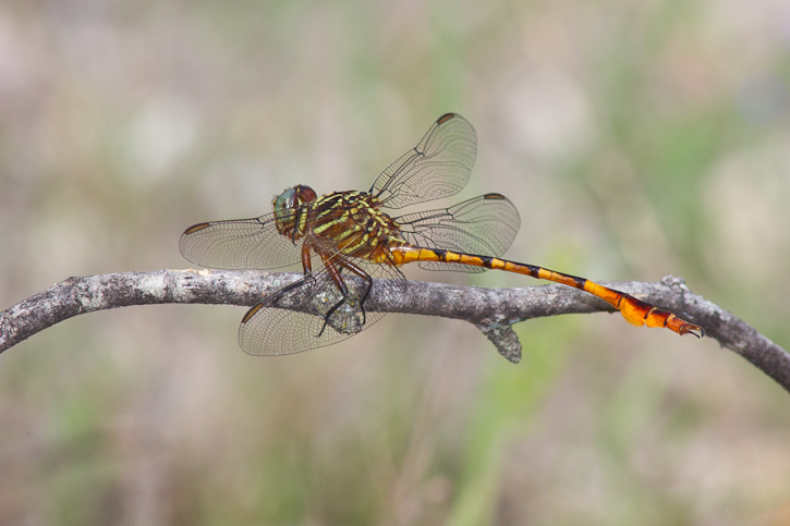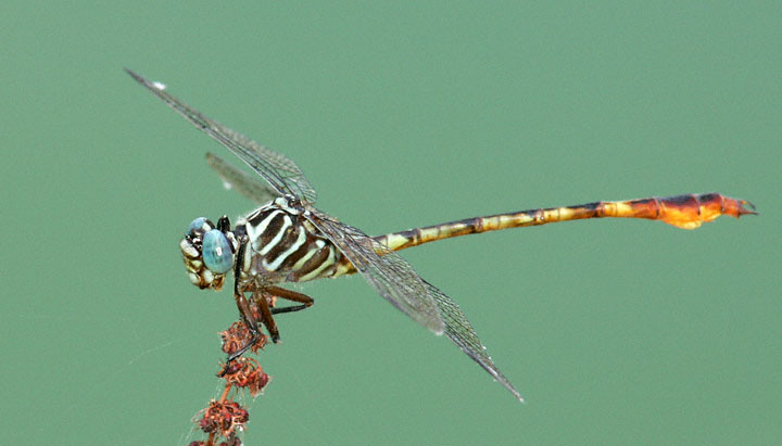 The male Narrow-striped Forceptail shown here was at Cook's Slough in Uvalde Co., Texas, in July, 2010. A Canon EOS 1D Mark IV and an EF 300mm F/4 L IS lens and 2X extender and 580 flash was used to take this shot. |