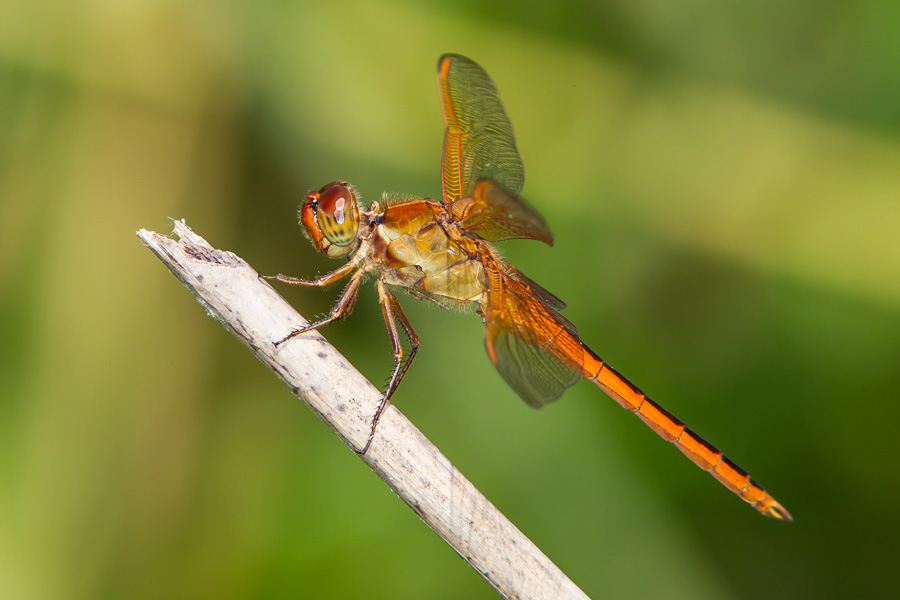 The Needham's Skimmer (Libellula needhami) is a common dragonfly of the Atlantic coast of the U.S., through Florida, and west along the Gulf coast to South Texas. It is primarily a coastal species but may often be found well inland. The shots of a worn female shown here were taken in Hidalgo Co., Texas, in August, 2005, with a Canon EOS 1D Mark II and EF 300mm F/4 L IS lens and 2X extender and 580 flash. I have a web page that compares Golden-winged Skimmer with the very similar Needham's Skimmer and provides identification comparisons. Click here if interested. |
