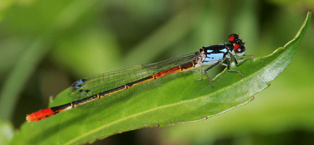 The Painted Damsel (Hesperagrion heterodoxum) might be considered one of the most colorful and beautiful damselflies in the United States. It occurs in southwest Texas, New Mexico and Arizona with some records north to Colorado. It also occurs in Mexico. The shots shown here (first image to 4th: adult male, younger male, female and very young female) were taken along Limpia Creek in Fort Davis, Jeff Davis Co., Texas with a Canon EOS 1D Mark II and EF 300 mm F/4 L IS lens with a 2X extender and 550 EX flash. | ![]() |