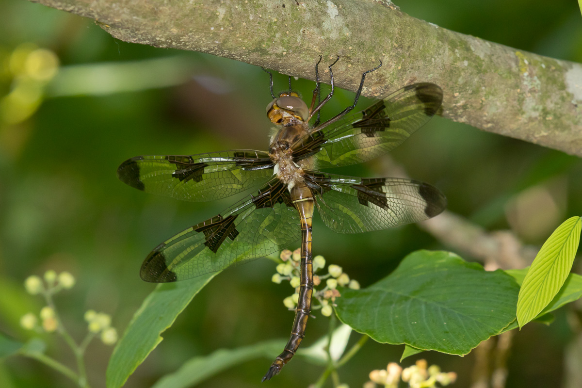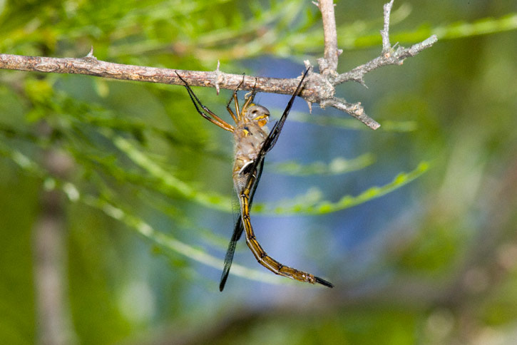 The next 3 images show a Prince Baskettail which has just emerged from its exuviae. These 3 images were taken with a Canon EOS 50D and an EF 70-200mm F/2.8 L IS lens and 2X extender and 580 flash at Buescher State Park, Bastrop Co., Texas, in May, 2009. Note that the wings are mostly clear at this stage, but the characteristic spots will form soon. | ![]() |