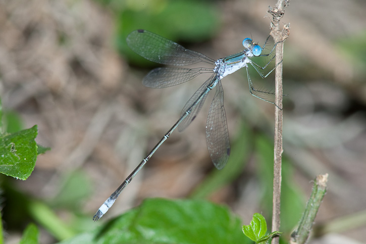 The Rainpool Spreadwing (Lestes forficula) only occurs in Texas within the United States, but it ranges south to Argentina. It is often quite uncommon in Texas, but occasionally can be found regularly in appropriate habitat. The first shot shown here was a digital capture at Bentsen Rio Grande State Park, Hidalgo Co. Texas in October, 2003, with a Canon EOS 10D and EF 70-200 mm F2.8 L IS lens with a 2X extender and 550 EX flash. | ![]() |
