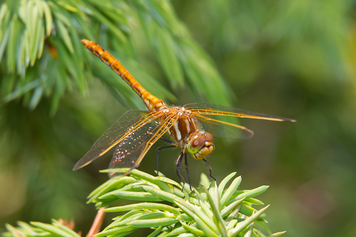 The Red-veined Meadowhawk (Sympetrum madidum) occurs in the north western quarter of the United States, south and east to parts of Colorado. It is fairly large for a meadowhawk and shows stripes on the thorax and red veins in the wings when mature. Younger or teneral individuals, like the first five images on this page, show yellow veined wings. These first five shots, three of a female and two shots of a male, were taken in the Lost Lake area of Larimer Co., Colorado, in July, 2011 with a Canon EOS 1D Mark IV and a Sigma 50-500mm lens and Canon 580 flash. | ![]() |